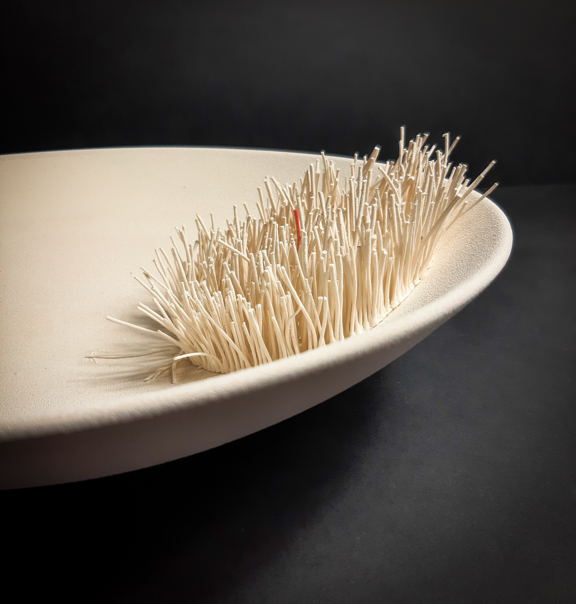 - Handgedraaide schaal 38cm waar aan een zijde een groep witte staafjes staan met in het midden één rood glanzend staafje.